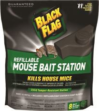 Black Flag Refillable Mouse Bait Station ; 8 baits ; Kills house mice |Child tamper-resistant station ; Easy to refill ; Includes 1 refillable bait station & bait blocks