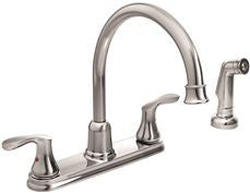 Chrome finish is highly reflective for a mirror-like look that works with any decorating style ; Features Duralock quick connect system for easy installation ; Two handle lever handles make it easy to adjust the water ; Includes side spray for convenient cleaning at the sink ; Aerated stream for everyday cleaning ; Meets current legislation, including ab1953 (California) and s152 (Vermont) ; Four hole ; 1/2'' connection size ; IPS ; 1.5 GPM ; Ceramic disc cartridge