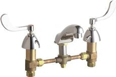 8'' fixed centers ; 5'' center to center rigid cast brass spout ; 0.5 GPM vandal proof aerator ; 4'' vandal proof wristblade handle ; Quaturn compression operating cartridge ; 1/2'' NPSM supply inlets and coupling nut for 3/8'' or 1/2'' flexible riser ; Chrome plate finish