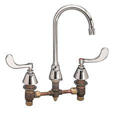 8'' fixed centers ; 5-1/4'' rigid/swing gooseneck spout ; 1.5 aerator ; 4'' vandal proof wristblade handle ; Quaturn compression operating cartridge ; 1/2'' NPSM supply inlets and coupling nut for 3/8'' or 1/2'' flexible riser ; Chrome plate finish