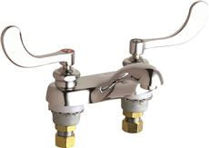 4'' fixed centers ; 4'' center to center integral cast brass spout ; 0.5 GPM aerator ; 4'' vandal proof wristblade handle ; Quaturn compression operating cartridge ; 1/2'' NPSM supply inlets and coupling nut for 3/8'' or 1/2'' flexible riser ; Chrome plate finish